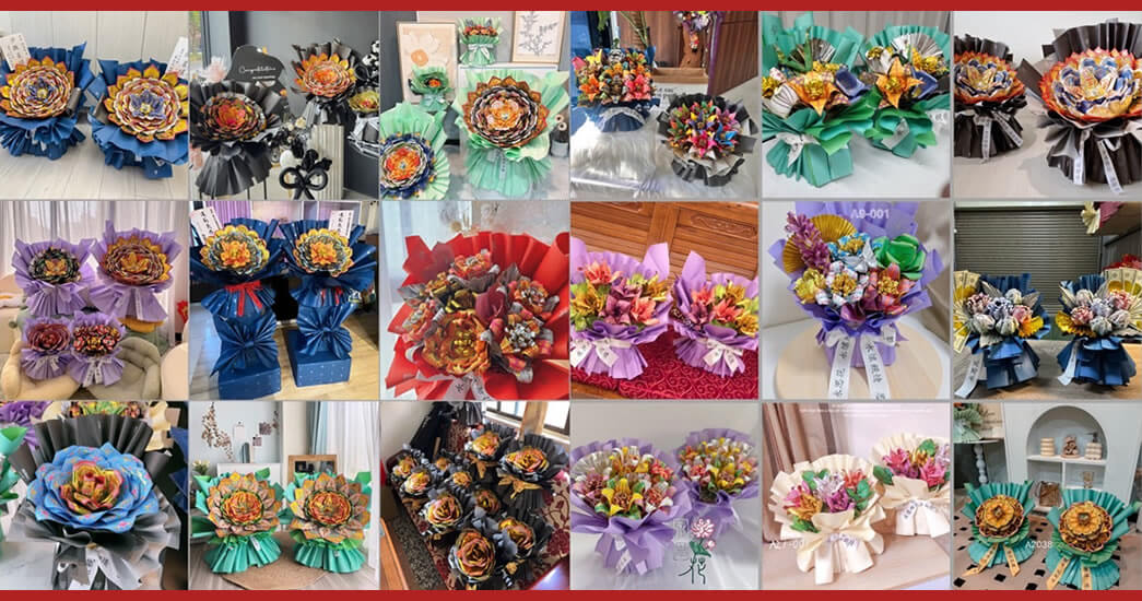 - 以維持價格及品質維護,包裝材料(包裝紙、底座基底、緞帶、七彩色紙、圓板等等..)需跟總公司統一叫貨,不可自行加入其他材料,例如乾燥花等非紙質東西,金紙可自由選擇店家購買。
